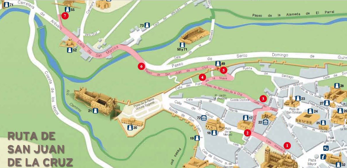 La ruta recorre los lugares más destacados en la vida de San Juan durante los tres años que duró su estancia en Segovia, recorriendo el camino que une los dos conventos de Carmelitas Descalzos de la ciudad: el convento femenino de San José, intramuros y el convento a orillas del río Eresma, donde era prior. Es un recorrido tranquilo y agradable que nos acercará a este poeta cumbre de la poesía mística. El itinerario comienza en la capilla de San Juan de la Cruz en la Catedral, desde donde nos dirigiremos al Convento de Carmelitas Descalzas de San José. En el descenso hasta el Convento de Carmelitas Descalzos, encontraremos la escultura del santo, obra de José María García Moro. Haremos una breve parada junto al arco del Refugio o Puerta de Santiago y en el Jardín de los Poetas, para analizar la simbología de este entorno y su relación con la obra poética de San Juan. Continuaremos el descenso por el paseo que lleva el nombre del santo hasta llegar al convento por él fundado, donde podremos contemplar su sepulcro. La visita guiada tiene una duración de dos horas aproximadamente.